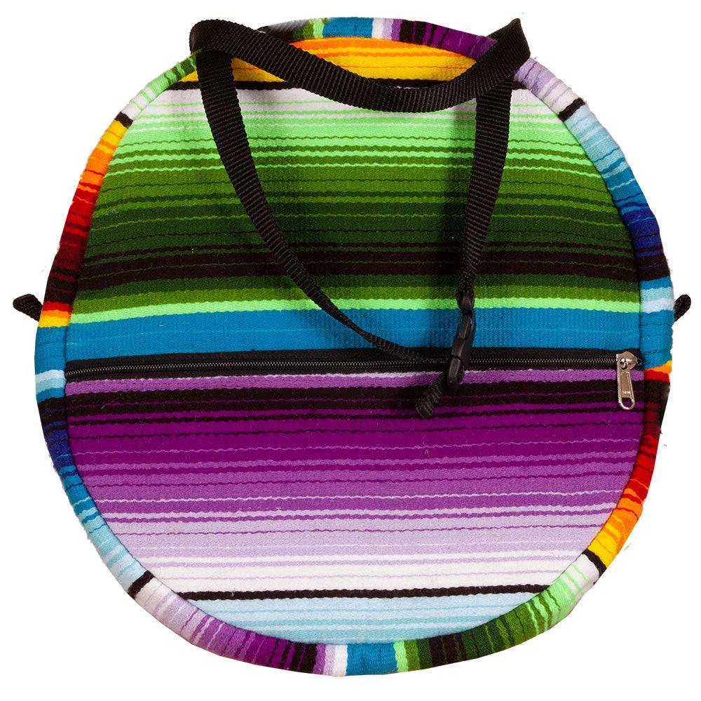 Vibrant, hand-woven Serape kid rope bag. This rope bag has a 14 inch diameter, fully lined with an outside zipper pocket and black web handle.