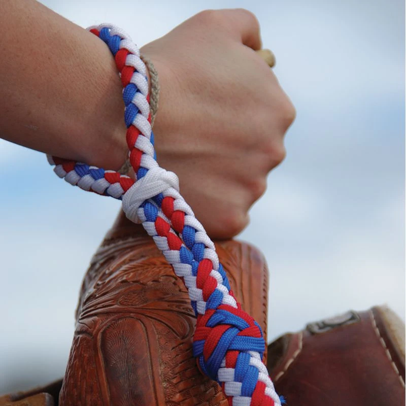 This quirt is braided nylon with a leather popper. It has an adjustable wrist ring so you won’t lose it when you grab the horn to make a turn.