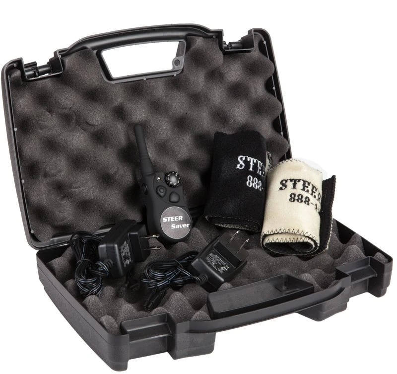 Dual Control you can help train and refresh sluggish, dragging or soured cattle and increase the longevity of your herd immensely, all from the convenience of your horse!! Transmits an adjustable stimulus to the steer. Voltage is adjustable for incremental training steps. Remote control operated. The receiver attaches to the steer`s tail with a washable Velcro wrap. One transmitter with two receivers. Operating off of two different frequencies, you can train two steer during the same session by directing your signal to the specified steer through it`s individual frequency. Great if you have more than one problem steer at once.